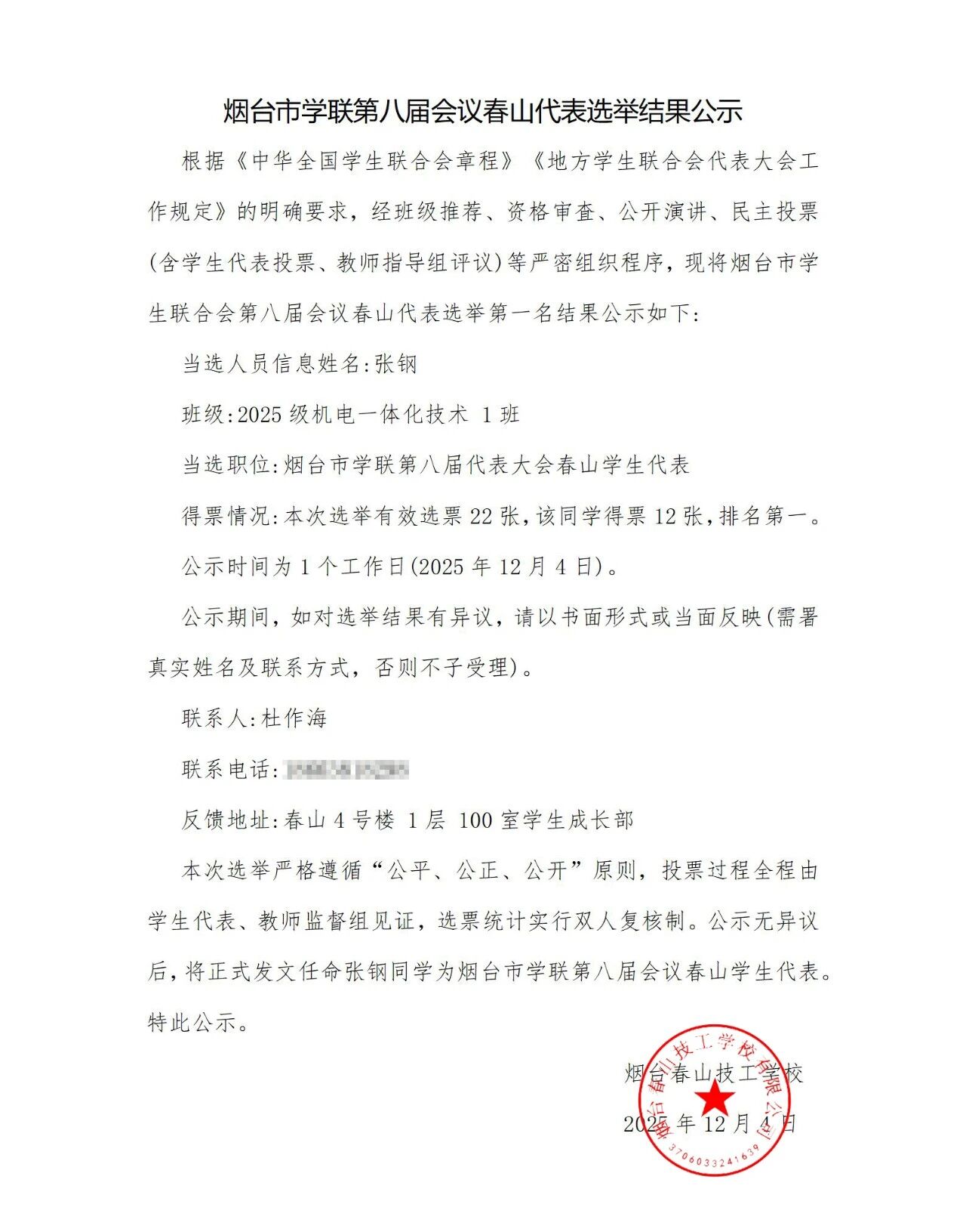 经民主选举,2025级机电一体化专业1班张钢同学当选为我校出席烟台市学生联合会第八次代表大会的代表。